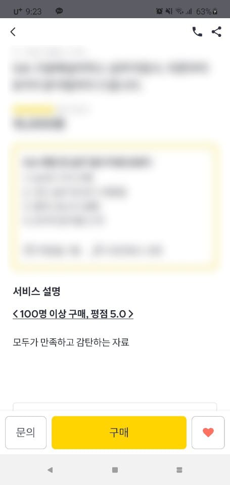 제가 현재 판매하고 있는 전자책 모바일 버전을 캡처한 것입니다. 모자이크 된 부분은 전자책을 설명하는 부분입니다. 설명 밑에 매력적인 문구가 하나 있습니다. "100명 이상 구매, 평점 5.0" 이런 말을 보면 어떤 생각이 드시나요? 저라면 이 책은 신뢰성이 있고 나에게 정말 도움이 되겠구나 라는 생각이 듭니다. 실제로 그런 부분을 노렸습니다. 모바일에 접속했을 시 어떤 문구가 보이는지도 생각해야 하고 작성해야 합니다.