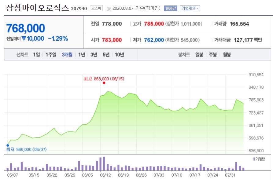 굳이 1~2년 전까지 안가 다러도 3개월 삼바 주가 흐름을 보면 최저점 대비 약 30만 원이 상승했습니다.