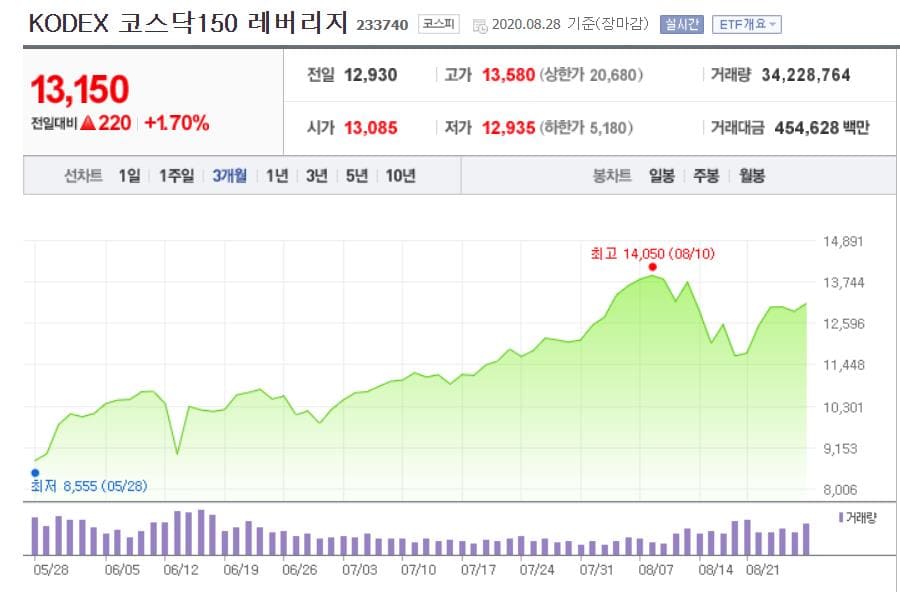 그렇기 때문에 주가 변동이 크지 않는 박스구간이나 지금과 같이 불안정한 상황 때에는 추천하지 않습니다. 코스닥 혹은 코스피가 지속적으로 상승하고 있을 때 레버리지를 구매해야 큰 수익을 낼 수 있습니다. 또한 코스피는 절대로 장기간 투자하면 안 되는데요.