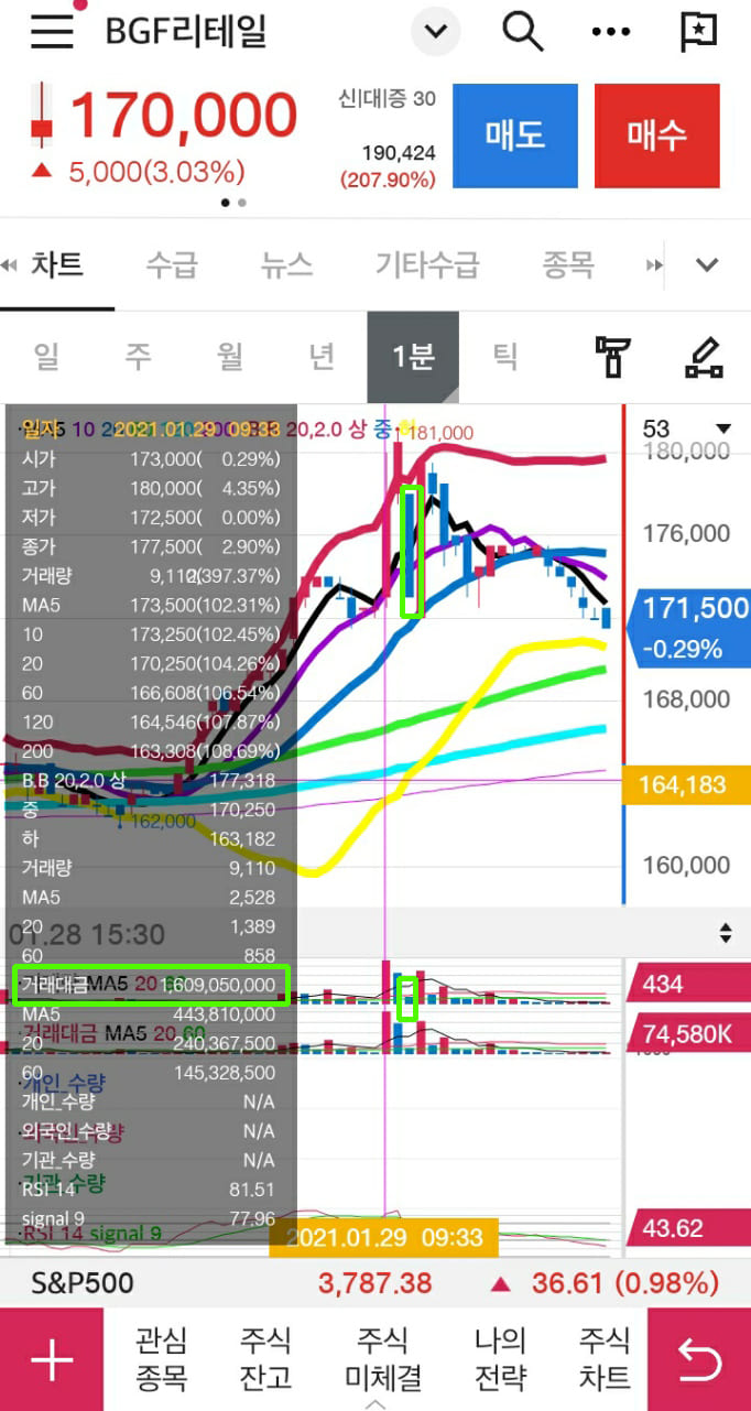 이와 반대로 위와 같이 비슷한 조건이지만 이 후 분봉들이 거대 거래금액 양봉과 비슷한 금액이 나온 후 음봉이 나왔다면 떨어질 가능성이 크므로 바로 매도하셔야 합니다. 위 이미지를 참고하세요.