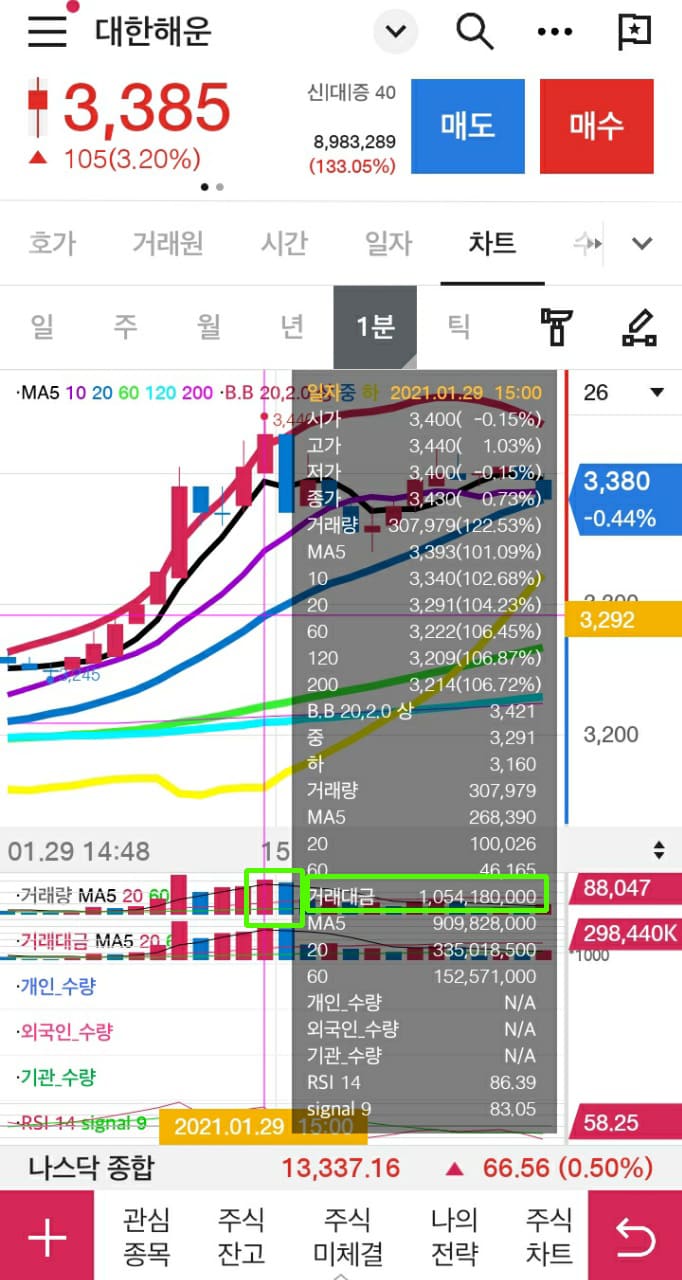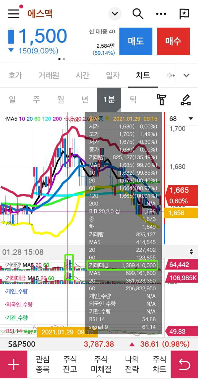 이와 반대로 위와 같이 비슷한 조건이지만 이 후 분봉들이 거대 거래금액 양봉과 비슷한 금액이 나온 후 음봉이 나왔다면 떨어질 가능성이 크므로 바로 매도하셔야 합니다. 위 이미지를 참고하세요.