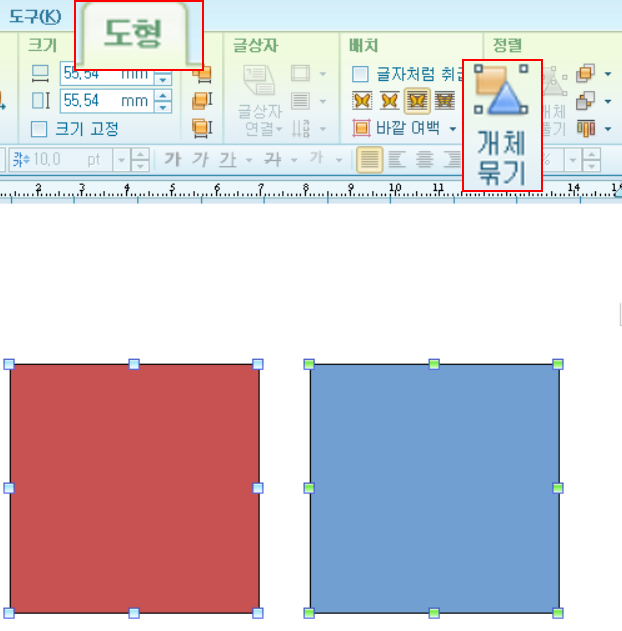 해당 버튼을 클릭하면 한글 프로그램이 각각의 도형을 이제 한 개의 개체로 인식하게 됩니다.