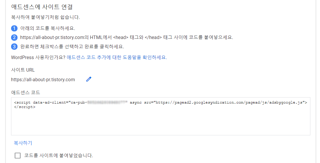 여기까지 따라왔다면 코드 구글애드센스가 코드를 주면서 head와 /head 사이에 넣으라고 합니다.