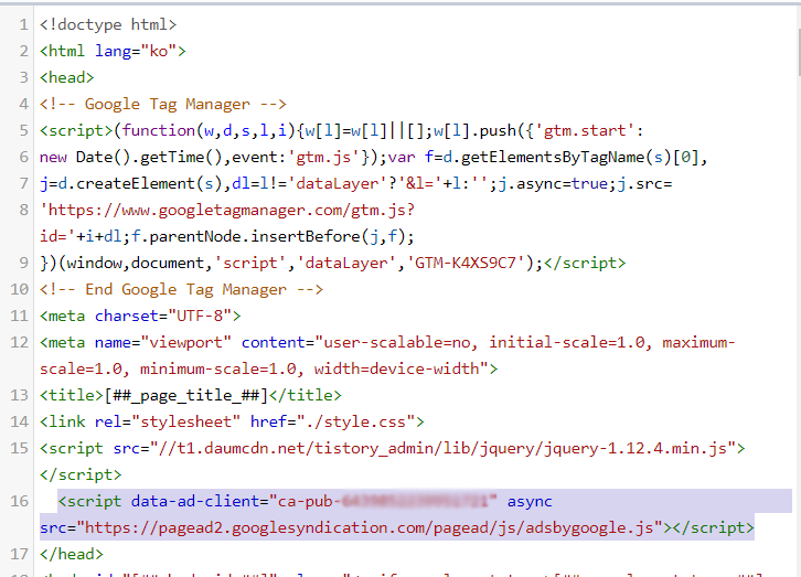 여기까지 따라왔다면 코드 구글애드센스가 코드를 주면서 head와 /head 사이에 넣으라고 합니다.