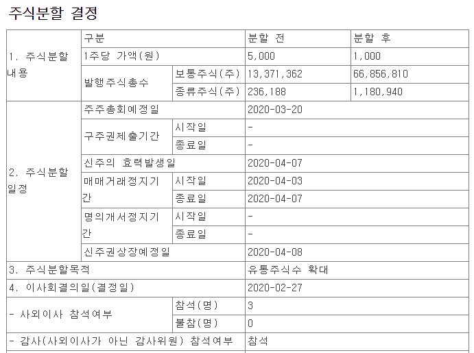 그렇기에 자기가 갖고 있는 주식의 액면분할 공시가 나왔다고 해서 무조건 좋아하거나 싫어할 필요는 없고 시황과 수급에 따라 매도, 매수를 결정하는 것이 현명한 판단일 것입니다.