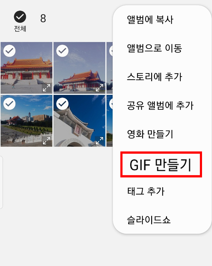 먼저 gif을 만들고 싶은 사진을 클릭 후 오른쪽 상단에 있는 옵션에 들어가 'GIF 만들기'를 클릭하면 됩니다.
