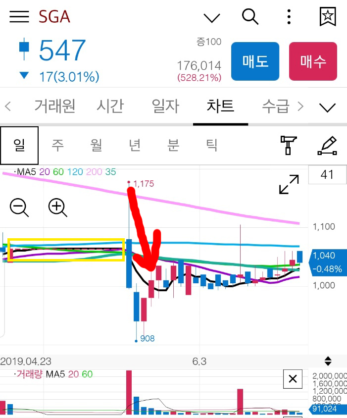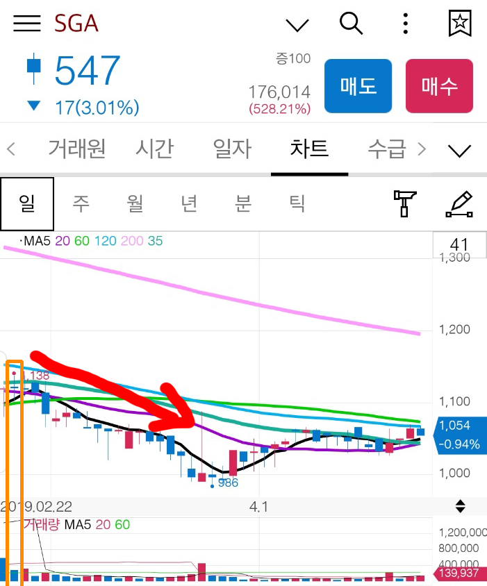 SGA는 2019년 2월 25일 병합 공시를 낸 후 지속적으로 하락하다가 거래 재개 당일 윗꼬리를 길게 만든 후 크게 하락하다가 보합세를 이어갔습니다.