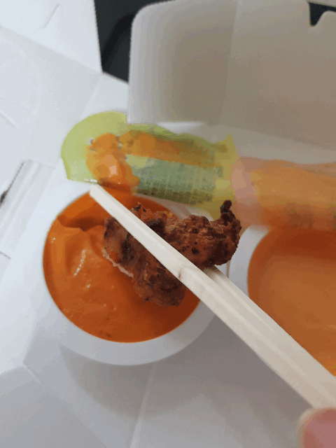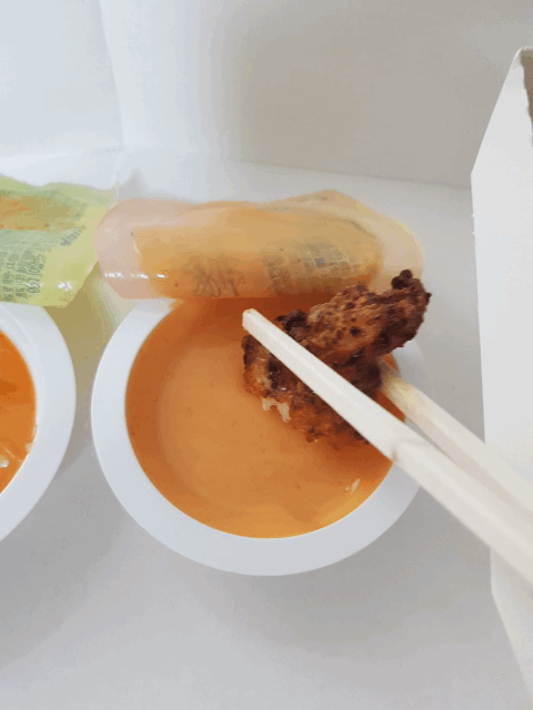 또한 고추 바사삭을 시키면 고블링 소스와 마블링 소스를 하나씩 주는데요.고블링 소스는 약간 매운 카레맛이 나고 마블링은 체다치즈의 맛이 났습니다. 솔직히 말해 둘 다 제 취향이 아니었습니다. 소스를 찍어 먹으면 담백해야 하는데 오히려 더 느끼해지더라고요. 만약 느끼한 것을 싫어하시는 분들이라면 매콤한 소스를 추가하는 것을 추천드립니다.