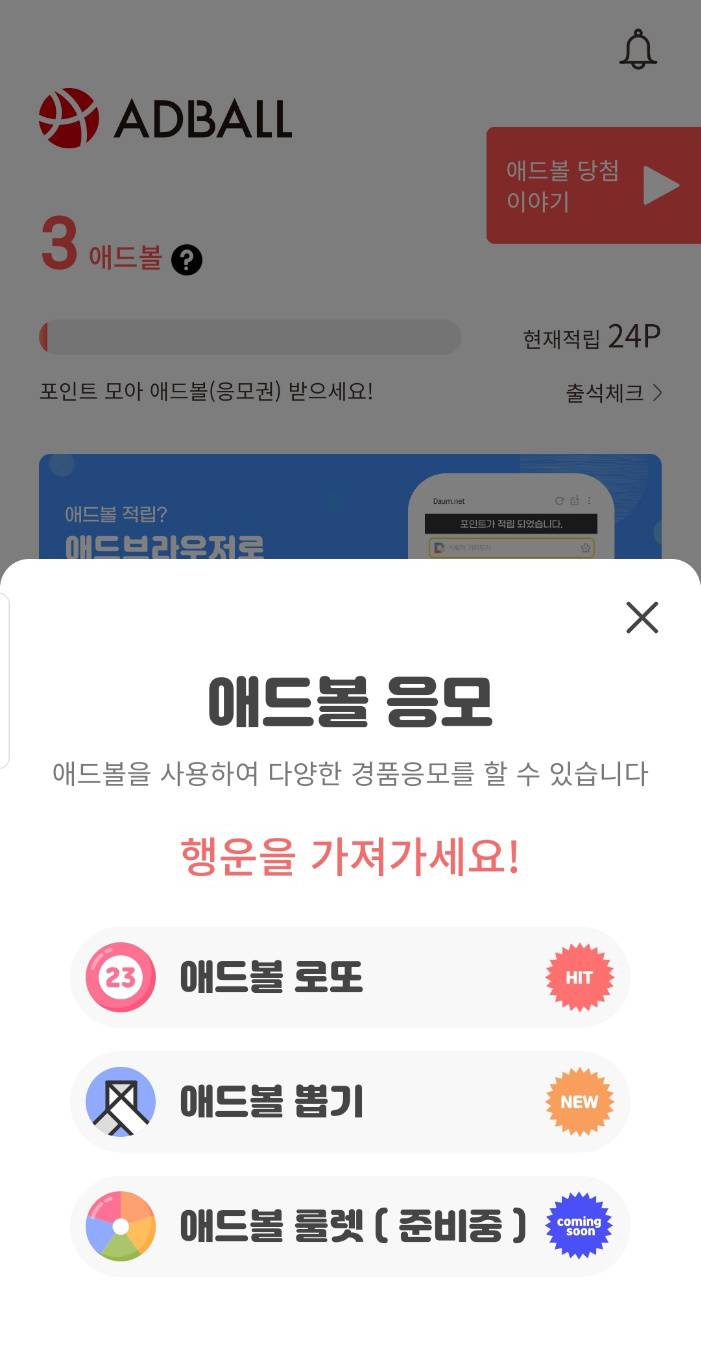 가장 쉬운 것이 출석체크입니다. 6번씩 출석 때마다 애드볼이 한개씩 지급되는데요. 발표가 주 1회 되므로 만근 출석을 하면 주 1회는 기본 참여가 가능합니다. 참고로 회원가입을 하면 애드볼 10개를 기본 제공하니 먼저 10개를 전부 소진한 다음 애드볼을 모와도 됩니다.